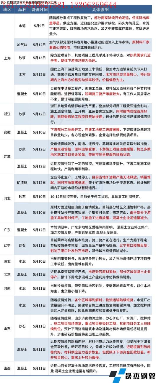 截至5月13日,據(jù)百年建筑網(wǎng)調研,12個省份建材市場受到了不同程度的影響。近期上海目前對全市建筑工地開展階梯式分類管理,重點聚焦涉疫工地,完善各項疫情防控措施,盡快實現(xiàn)建筑工地社會面清零,為建筑工地全面復工復產(chǎn)奠定基礎。加之近期華南地區(qū)雨水天氣來臨,運輸和終端施工進度受限,因此建材行情弱勢運行。待全國疫情和汛期有所好轉,公路、高速等基建項目支撐起一定需求,部分材料的發(fā)運量會有所提升。具體情況如下: