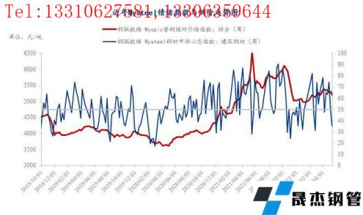 具體各品種指數(shù)來看,5月13日建筑厚壁無縫鋼管情緒指數(shù)為35.56,較5月6日回落13.31;熱軋板卷情緒指數(shù)為50.82,較5月6日回落3.98;冷軋板卷情緒指數(shù)為54.03,較5月6日回落1.6;中厚板情緒指數(shù)為51.95,較5月6日回落4.96;結(jié)構(gòu)鋼情緒指數(shù)為31.09,較5月6日回落14.75;工業(yè)線材情緒指數(shù)為38.74,較5月6日回落9.86;鍍鋅板卷情緒指數(shù)為37.51,較5月6日回落12.84;焊接厚壁鋼管情緒指數(shù)為47.48,較5月6日回落7.79;無縫厚壁鋼管情緒指數(shù)為35.23,較5月6日回落27.27;帶鋼情緒指數(shù)為48.44,較5月6日回落9.25。