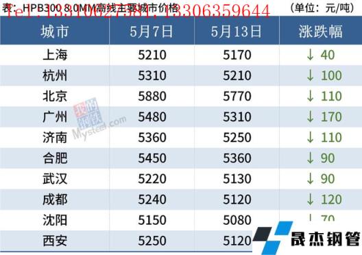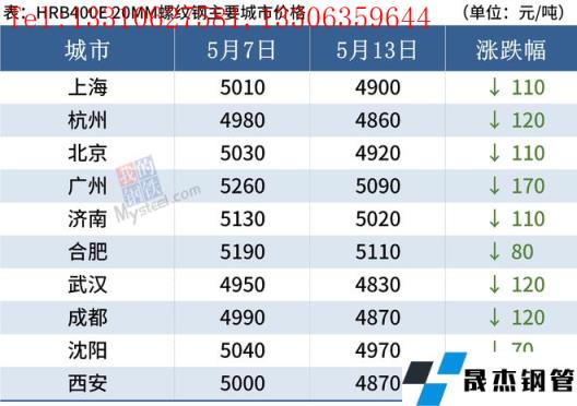 據(jù)監(jiān)測,截至5月13日,全國主要城市20mm三級(jí)抗震螺紋鋼均價(jià)4956元/噸,較5月7日下跌114元/噸;8.0mmHPB300高線均價(jià)5205元/噸,較5月7日下跌101元/噸。
