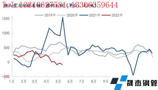 鋼坯盈利情況:本周唐山地區(qū)主流樣本無縫厚壁鋼管廠家平均鐵水不含稅成本為3665元/噸,平均鋼坯含稅成本4721元/噸,周環(huán)比下調(diào)105元/噸,與5月14日普方坯出廠價(jià)格4660元/噸相比,無縫厚壁鋼管廠家平均毛利潤-61元/噸,周環(huán)比下調(diào)45元/噸。