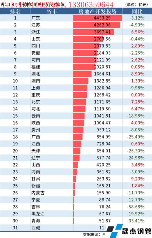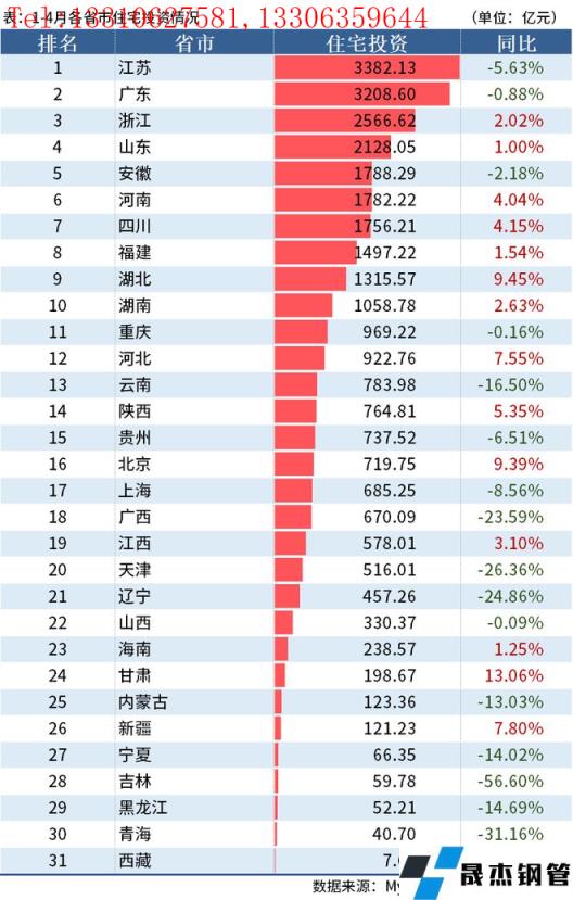 住宅投資方面,投資額超千億的有10個省市,其中江蘇、廣東和浙江分別以3382.13億元、3208.6億元、2566.62億元的投資額位排名前三。累計同比方面,有10個省市同比降幅超10%,其中降幅最大的依然是吉林省,同比下降56.6%;同比增幅超10%的僅有甘肅一省,同比增長13.06%。