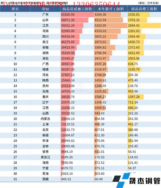 從各省市房地產(chǎn)開發(fā)規(guī)模與開、竣工面積增長情況來看,31省市1-4月的商品房屋施工面積共818512.92萬平方米,其中25省市施工面積在10000萬平方米以上。排名前三的依然是廣東、山東和江蘇,施工面積均在50000萬平方米以上,其中廣東施工面積超80000萬平方米。排在末三位的為寧夏、青海、西藏,施工面積依然低于5000萬平方米,其中西藏施工面積僅有848.52萬平方米。