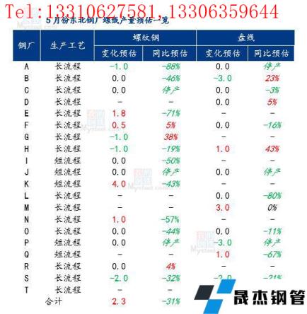 據(jù)4月底的調(diào)研,5月東北無縫厚壁鋼管廠家螺紋和盤線的計劃產(chǎn)量分別為119.5萬噸和95.9萬噸,同比減少57.1萬噸和26.3萬噸,環(huán)比增加10.5萬噸和12.3萬噸;受市場價格下行影響,無縫厚壁鋼管廠家虧損幅度擴(kuò)大,部分多品種生產(chǎn)的無縫厚壁鋼管廠家根據(jù)各品種的虧損幅度和訂單情況進(jìn)行品種間的轉(zhuǎn)產(chǎn),單一生產(chǎn)螺線的無縫厚壁鋼管廠家部分復(fù)產(chǎn)、部分加大減產(chǎn),具體情況如下: