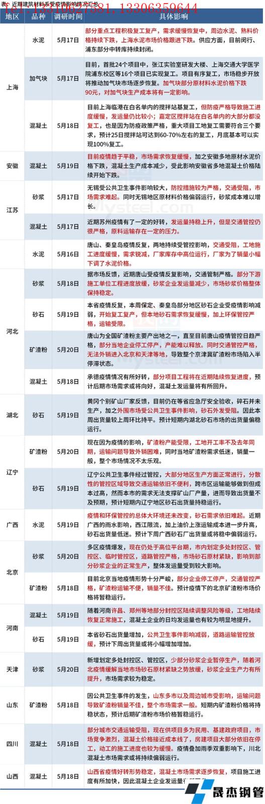 截至5月20日,據(jù)百年建筑網(wǎng)調研,14個省份建材市場受到了不同程度的影響。隨著華東、華南疫情和暴雨情況的緩解,物流運輸逐步恢復正常,材料進場速度加快,下游工地施工節(jié)奏提升。在疫情有效管控下,基建、房建方面的需求陸續(xù)回升,但由于疫情反復抬頭的影響,仍有上行空間有限。具體情況如下: