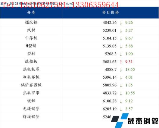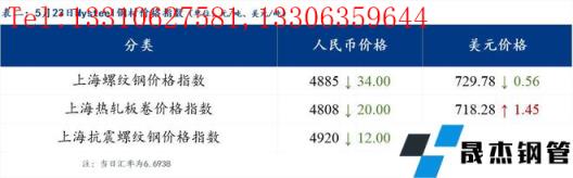 5月23日普鋼絕對(duì)價(jià)格指數(shù)變化:綜合指數(shù)5094.32,下跌8.39;螺紋鋼指數(shù)4842.56,下跌9.26;線材指數(shù)5239.01,下跌5.27;熱軋板卷指數(shù)4888.7,下跌13.55;冷軋板卷指數(shù)5396.14,下跌4.01;中厚板指數(shù)5104.15,下跌8.67。