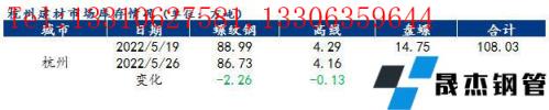分品種來(lái)看,以杭州市場(chǎng)為例,本周杭州市場(chǎng)建筑厚壁無(wú)縫鋼管總庫(kù)存為102.80萬(wàn)噸,其中螺紋鋼庫(kù)存86.73萬(wàn)噸,周環(huán)比減少2.26萬(wàn)噸,降幅為2.54%;盤(pán)螺11.91萬(wàn)噸,周環(huán)比減少2.84萬(wàn)噸,降幅為19.25%;線材4.16萬(wàn)噸,周環(huán)比減少0.13萬(wàn)噸,降幅為3.03%。