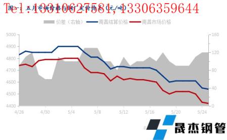 5月份南昌建筑厚壁無縫鋼管市場價(jià)格一路下行,具體來看,4月26日至5月25日期間南昌建筑厚壁無縫鋼管現(xiàn)貨市場最高價(jià)格為4800元/噸,最低價(jià)格為4420元/噸,較上月最高價(jià)與最低價(jià)分別下降70元/噸和300元/噸,期間市場價(jià)格單邊下行振幅為380元/噸。