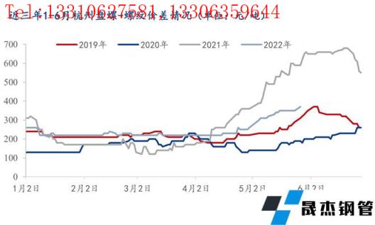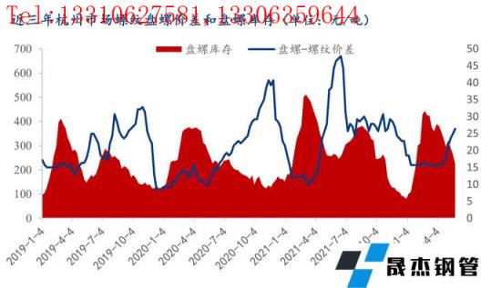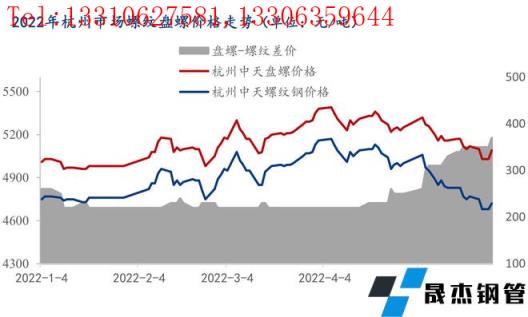 2022年初起受需求偏弱,庫存持續(xù)居高不下影響,浙江市場(chǎng)主流無縫厚壁鋼管廠家盤螺螺紋價(jià)差基本穩(wěn)定在200元/噸附近水平。而4月下旬以來,主流無縫厚壁鋼管廠家盤螺與螺紋價(jià)差逐步擴(kuò)大,到5月下旬有進(jìn)一步擴(kuò)大的趨勢(shì)。截止5月27日,以杭州市場(chǎng)為例,中天HRB40016-25mm螺紋鋼4700元/噸,中天HRB4008-10mm盤螺5080元/噸,盤螺價(jià)格高于螺紋鋼380元/噸,由此浙江市場(chǎng)盤螺價(jià)格再次成為全國(guó)相對(duì)高位。近期浙江各市場(chǎng)盤螺庫存加速去化,主流無縫厚壁鋼管廠家盤螺與螺紋價(jià)差走勢(shì)有進(jìn)一步擴(kuò)大的趨勢(shì)。筆者調(diào)研了解到主要有以下幾點(diǎn)原因,給大家做個(gè)簡(jiǎn)要分析: