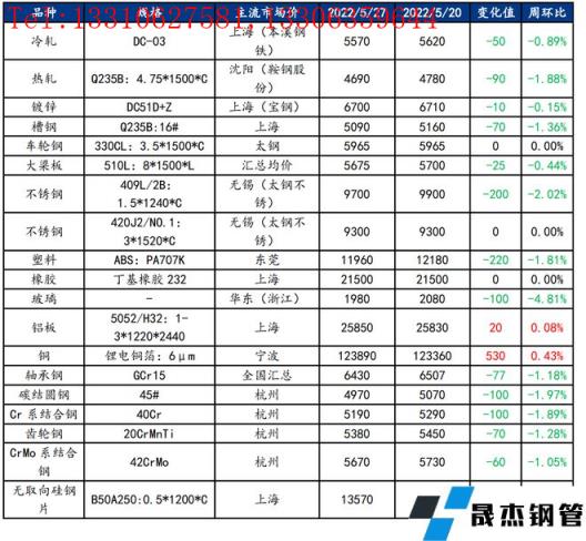 截止2022年5月27日,各原材料當日即時價格以及價格周環(huán)比情況如下:
