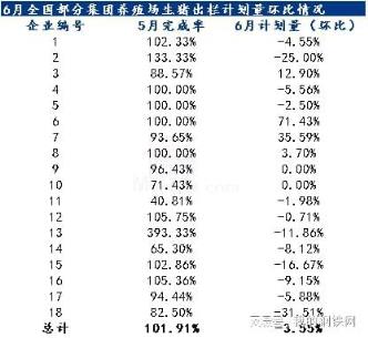 據(jù)農(nóng)產(chǎn)品調(diào)研了解,針對(duì)18家集團(tuán)養(yǎng)殖場(chǎng)全國(guó)生豬出欄情況來(lái)看,5月生豬出欄完成率總計(jì)101.91%,6月出欄量較5月實(shí)際出欄量環(huán)比下跌3.55%。