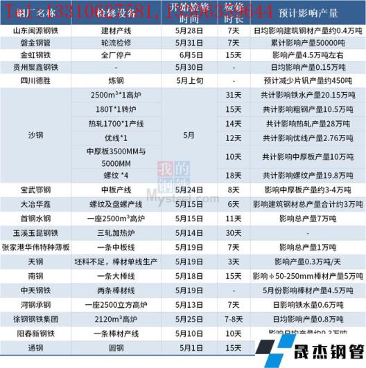 據(jù)不完全統(tǒng)計(jì),5月國內(nèi)18家無縫厚壁鋼管廠家發(fā)布檢修計(jì)劃。其中,磐金厚壁鋼管各分廠計(jì)劃將于5月31日至6月6日進(jìn)行輪流檢修,預(yù)計(jì)將累計(jì)影響產(chǎn)量50000噸。