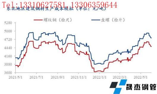 受無縫厚壁鋼管廠家利潤擠壓至負(fù)影響,4、5月份原材料價格被迫下調(diào),焦炭4輪提降降800元/噸,但從無縫厚壁鋼管廠家層面了解到,降價后焦化廠新接訂單量少、實際落地效果有限。從東北地區(qū)建筑厚壁無縫鋼管生產(chǎn)成本模型(最低成本模式)來看,截至2022年5月末,東北地區(qū)螺紋鋼模擬生產(chǎn)成本4480元/噸左右、較4月末增加15元/噸、較去年5月末增加190元/噸,盤螺模擬生產(chǎn)成本4770元/噸左右、較4月末增加20元/噸左右、較去年5月末增加200元/噸;從月均成本來看,2022年5月螺紋模擬生產(chǎn)成本4570元/噸、較4月增加310元/噸、較去年5月增加560元/噸,盤螺模擬生產(chǎn)成本4860元/噸、較4月增加320元/噸、較去年5月增加580元/噸。