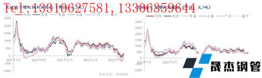 具體來看,2022年6月東北建筑厚壁無縫鋼管模擬月均利潤中廣州螺紋鋼利潤環(huán)比減少322元/噸、出現(xiàn)了132元/噸的虧損,盤螺利潤環(huán)比減少180元/噸、出現(xiàn)了180元/噸的虧損,??诜较蚵菁y鋼、盤螺利潤也僅為11元/噸、49元/噸,加上4月份廣州、??谝蔡幱趬|底狀態(tài),說明當(dāng)前華南市場依舊不是東北資源的最佳流向,而華北、華東5月份疫情分控相對較嚴(yán)格,資源流動受限較多,利潤模型上雖超了華南,但無縫厚壁鋼管廠家實際獲取利潤或相對有限。