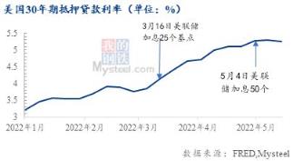 美聯(lián)儲(chǔ)為了抑制國內(nèi)通脹,分別于3月16日和5月4日加息25和50個(gè)基點(diǎn),預(yù)計(jì)將在今年累計(jì)加息100個(gè)基點(diǎn)。而伴隨著美聯(lián)儲(chǔ)的不斷加息,截至本周,30年期抵押貸款利率飆升至5.1%,處于歷史高位。