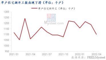 而房貸利率的飛速上漲,使得消費(fèi)者的購買欲望隨之下降。再疊加美國房價(jià)居高不下,4月現(xiàn)有房屋銷售中位數(shù)價(jià)格同比去年上漲14.8%至391200美元,創(chuàng)1999年以來新高,導(dǎo)致房屋銷售和單戶新開工數(shù)量均出現(xiàn)下滑。截至4月,單戶新開工數(shù)量為110萬,已連續(xù)兩月下降,較今年2月下降9%。