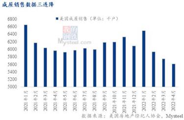 在美聯(lián)儲(chǔ)持續(xù)加息的預(yù)期和房價(jià)居高不下的雙重壓力下,美國樓市泡沫逐漸破碎,樓市繁榮面臨考驗(yàn)。我們預(yù)計(jì)5月房屋銷售數(shù)據(jù)和單戶住宅新開工數(shù)量均環(huán)比下滑,帶動(dòng)著木材價(jià)格同樣走弱。