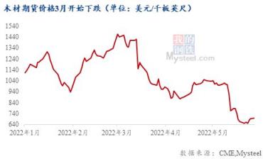 美國木材價(jià)格與房市高度相關(guān),隨著消費(fèi)者對(duì)房地產(chǎn)的購買意愿下降,木材價(jià)格也隨之降溫。美國木材期貨價(jià)格從今年三月初的高點(diǎn)開始下落,截至5月底,木材期貨價(jià)格下降765至700美元/千板英尺。