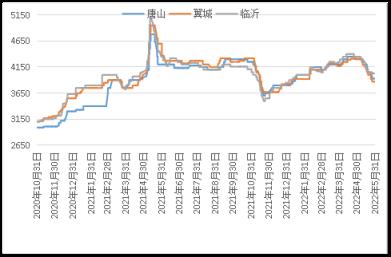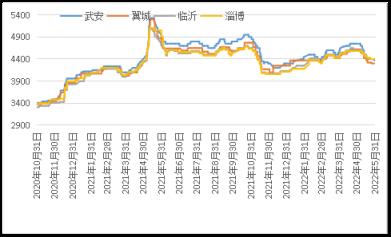 據(jù)云商平臺(tái)監(jiān)測(cè)數(shù)據(jù)顯示,截至5月31日,煉鋼生鐵天津地區(qū)報(bào)價(jià)3910元(噸價(jià),下同),較月初跌360元;唐山地區(qū)報(bào)價(jià)3930元,較月初跌370元;翼城地區(qū)報(bào)價(jià)3870元,較月初跌440元;臨沂地區(qū)報(bào)價(jià)4030元,較月初跌320元(詳見圖2)。