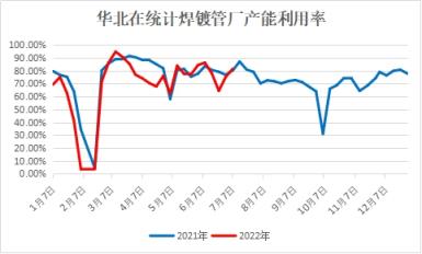 焊鍍管廠產(chǎn)能走勢(shì)與往年趨同,但更具靈活性。1月中旬左右冬奧會(huì)管控供應(yīng)端消息發(fā)散,停產(chǎn)停工晚于往年,南方部分管廠產(chǎn)線在28日-29日左右停工。焊管尤其是鍍鋅管春節(jié)后產(chǎn)量恢復(fù)慢于往年,2月中旬生產(chǎn)管控有所放松。進(jìn)入3月,河北多地連續(xù)兩次封控,長達(dá)51天,管廠向外發(fā)運(yùn)運(yùn)力較低,焊鍍管生產(chǎn)企業(yè)產(chǎn)能利用率最高下降了32.55個(gè)百分點(diǎn)。其他時(shí)間管廠整體開工率基本靈活把控在75%左右,上半年在統(tǒng)計(jì)管廠平均產(chǎn)能利用率69.97%,較去年下降5.87個(gè)百分點(diǎn)。供需基本面雖有一定改善,但今年各品牌資源競爭激烈,下半年淡季階段管廠多是按需靈活控產(chǎn),整體產(chǎn)能相較平穩(wěn),利用套期保值等工具規(guī)避風(fēng)險(xiǎn),從而實(shí)現(xiàn)利潤回歸。