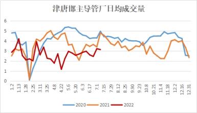 上半年全國粗鋼產(chǎn)量4.36萬噸,同比減少3066萬噸,降幅6.58%;上半年粗鋼消費(fèi)量4.00萬噸,同比減少4732萬噸,降幅10.59%;截至7月8日,全國厚壁鋼管庫存1364.7萬噸,同比去年同期累庫39.4萬噸,增幅2.89%;同時(shí),唐山地區(qū)鋼坯庫存96.4萬噸,同比累庫62.8萬噸,增幅65.15%。上半年日均鐵水產(chǎn)量240萬噸左右,假設(shè)全年產(chǎn)量平控,下半年鐵水產(chǎn)量回落預(yù)期后置,且下降空間有限。