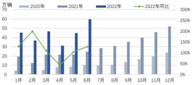6月份,新能源汽車產(chǎn)銷分別完成59萬輛和59.6萬輛,同比均增長1.3倍,產(chǎn)銷量同比增速明顯回升。1-6月份,新能源汽車產(chǎn)銷分別完成266.1萬輛和260萬輛,同比均增長1.2倍,市場(chǎng)占有率21.6%。中汽協(xié)預(yù)計(jì),2022年新能源汽車銷量有望達(dá)到550萬輛,同比增長56%以上。