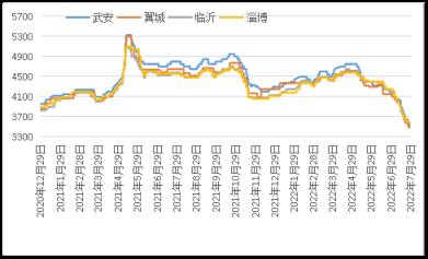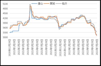 據(jù)云商平臺監(jiān)測數(shù)據(jù)顯示,截至7月29日,煉鋼生鐵天津地區(qū)報(bào)價(jià)3120元(噸價(jià),下同),較月初跌550元;唐山地區(qū)報(bào)價(jià)3150元,較月初跌550元;翼城地區(qū)報(bào)價(jià)3100元,較月初跌620元;臨沂地區(qū)報(bào)價(jià)3350元,較月初跌500元(詳見圖2)。