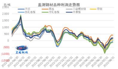 以四周原料庫存測算各品種的毛利表現(xiàn)來看,隨著前期成本的逐步下移,各品種毛利均呈現(xiàn)震蕩回升狀態(tài)。研究中心監(jiān)測數(shù)據(jù)顯示,8月底,除熱軋卷板及冷軋卷板仍有部分虧損外,其他各品種已重返盈利區(qū)間。從月度整體來看,監(jiān)測的七大品種盈利均有所改善,改善幅度在431-566元/噸之間。其中,三級螺紋鋼的月均盈利改善幅度最大,為566元/噸;中厚板的月均改善幅度最小,為431元/噸;其他品種改善幅度在488-546元/噸之間(詳見圖3)。